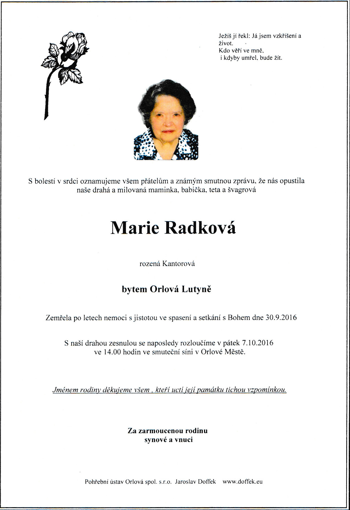 V pátek 30. září 2016, ve věku 77 let, zemřela sestra Marie Radková. Poslední rozloučení se sestrou proběhlo v pátek 7. října v 14:00 ve smuteční síni v Orlové Městě.